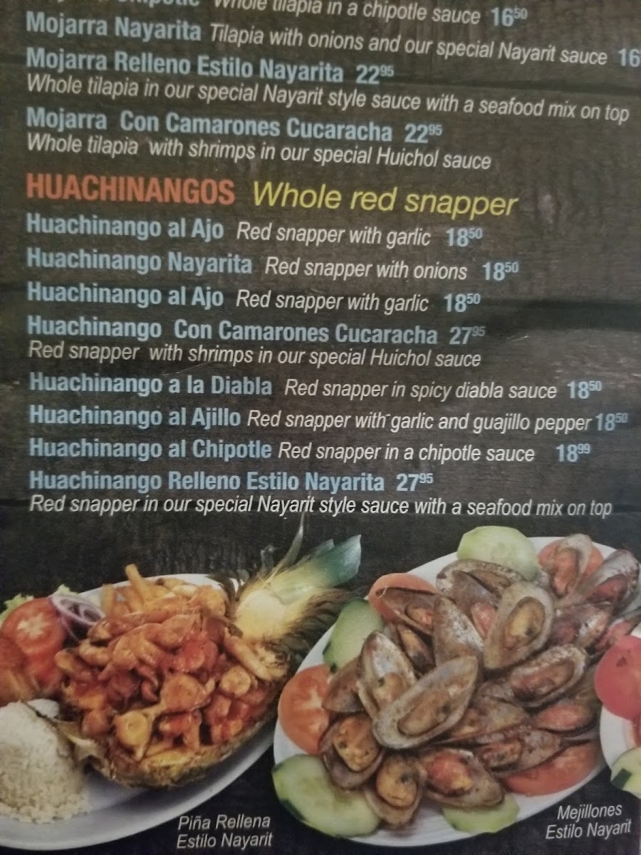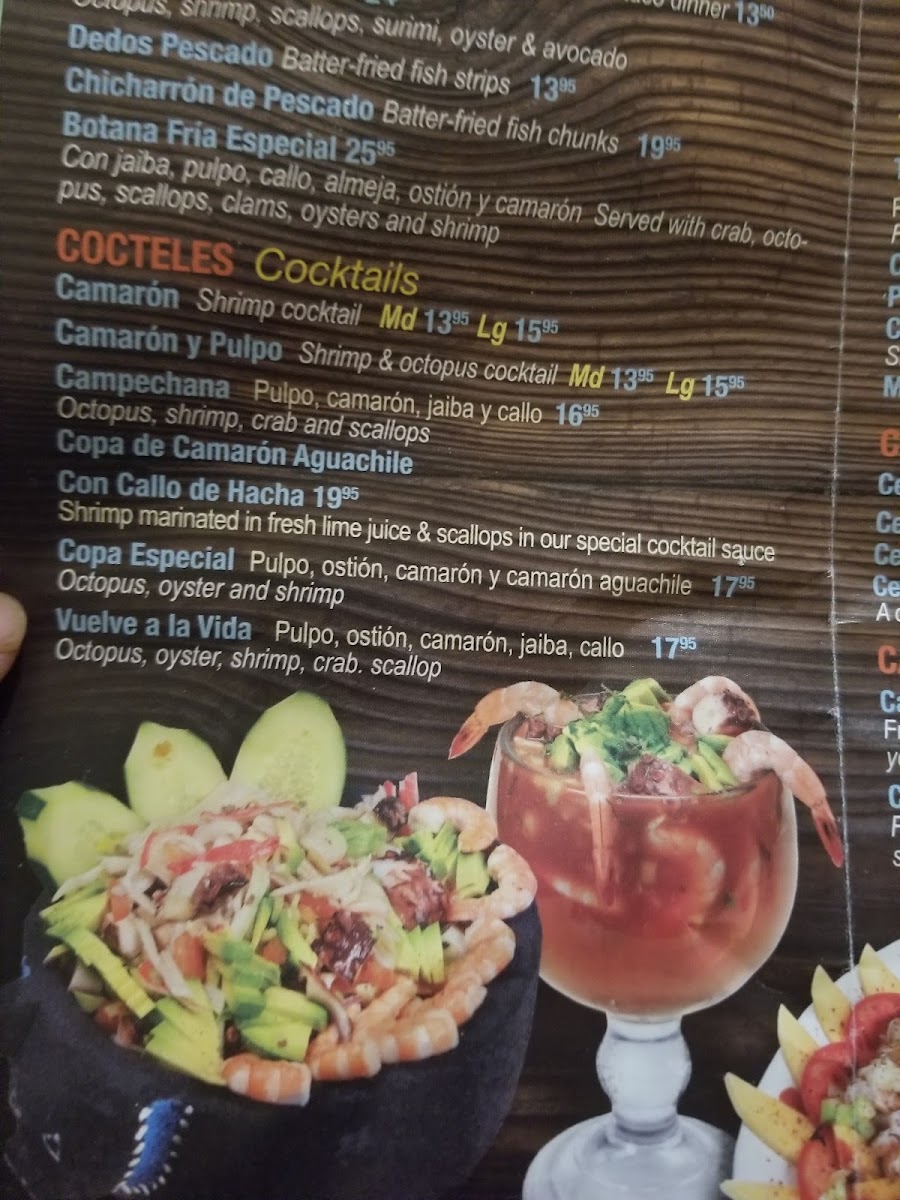 Con jaiba, pulpo, callo, almeja, ostion y camaron served with crab, octopus, scallops, clams, oysters and shrimp